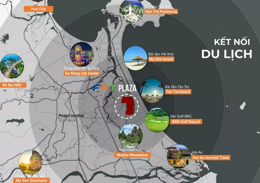Trong bán kính 5–15 phút, cư dân có thể đến sân bay, trường học FPT, bệnh viện quốc tế, khu mua sắm, sân golf và các tiện ích công nghệ khác. Kết nối này giúp cư dân vừa tận hưởng không gian xanh, vừa thuận tiện cho việc học tập – làm việc và khai thác cho thuê căn hộ khi cần.